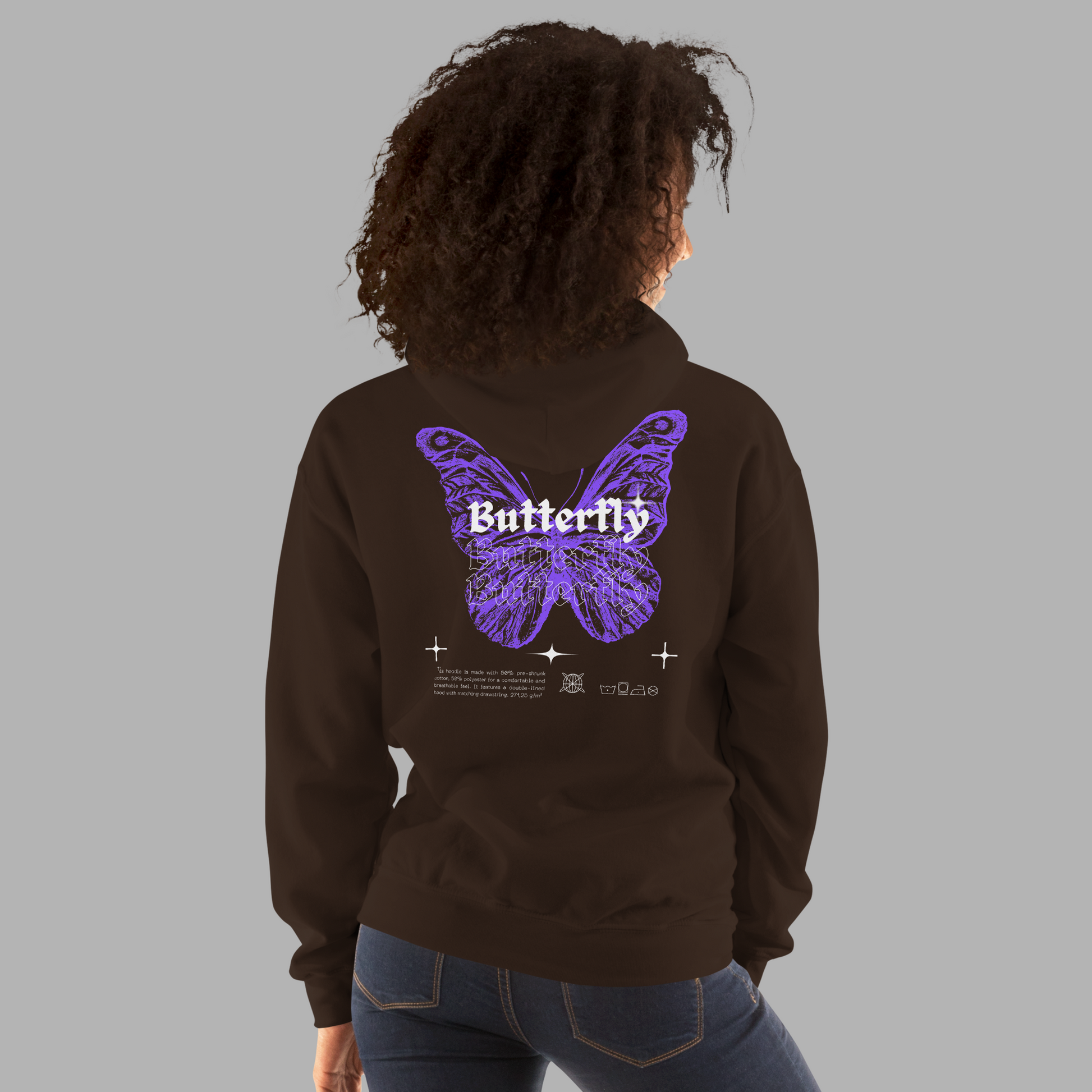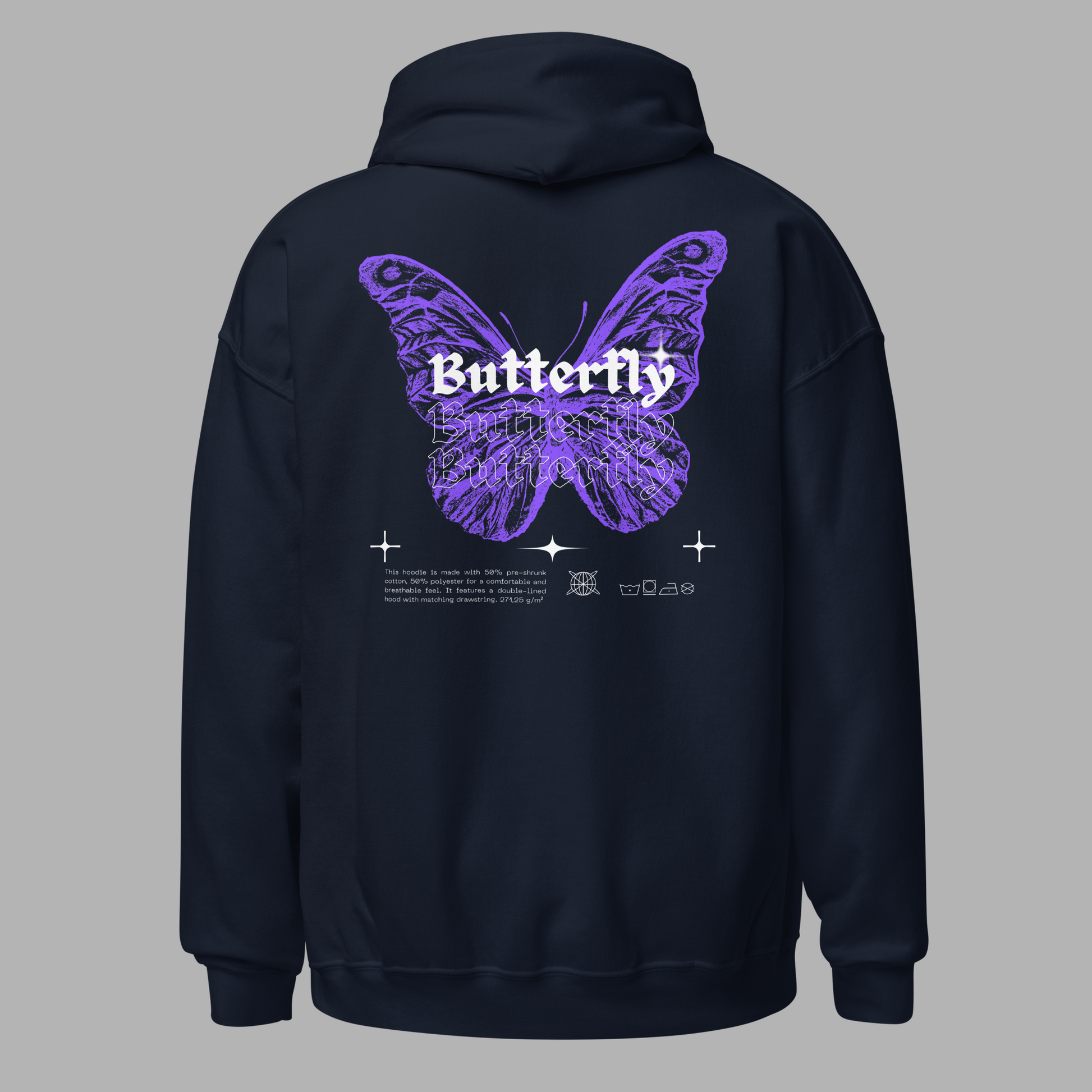Der Schmetterling auf dem Hoodie steht für Veränderung und die Kraft, sich immer wieder neu zu erfinden. Er repräsentiert die Freiheit und die Fähigkeit, über Hindernisse hinwegzufliegen.